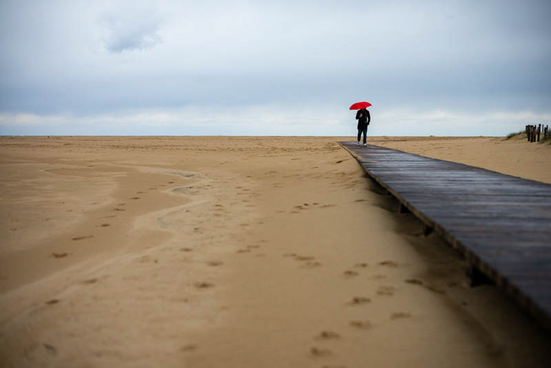 Man walking back from the sea in the rain. The red umbrella is creating a vibrant contrast against the overcast sky: Red and grey. Just maybe. There is a possibility. A path to hope.